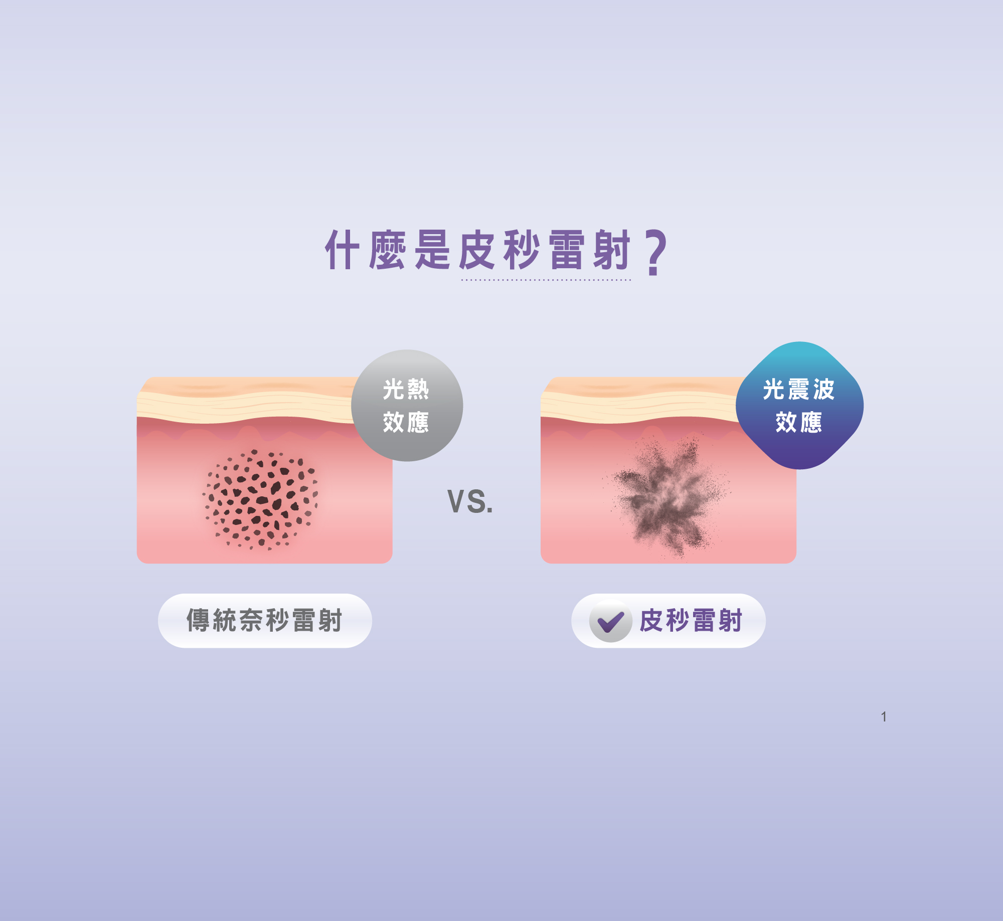 「皮秒」是非常短的時間單位,相較於傳統奈秒雷射快1000倍。皮秒雷射不但能將色素擊碎成更細、更小的粉塵,且雷射停留在肌膚時間更短,對肌膚熱傷害更少,是治療效果更好、副作用更少的皮膚治療技術。