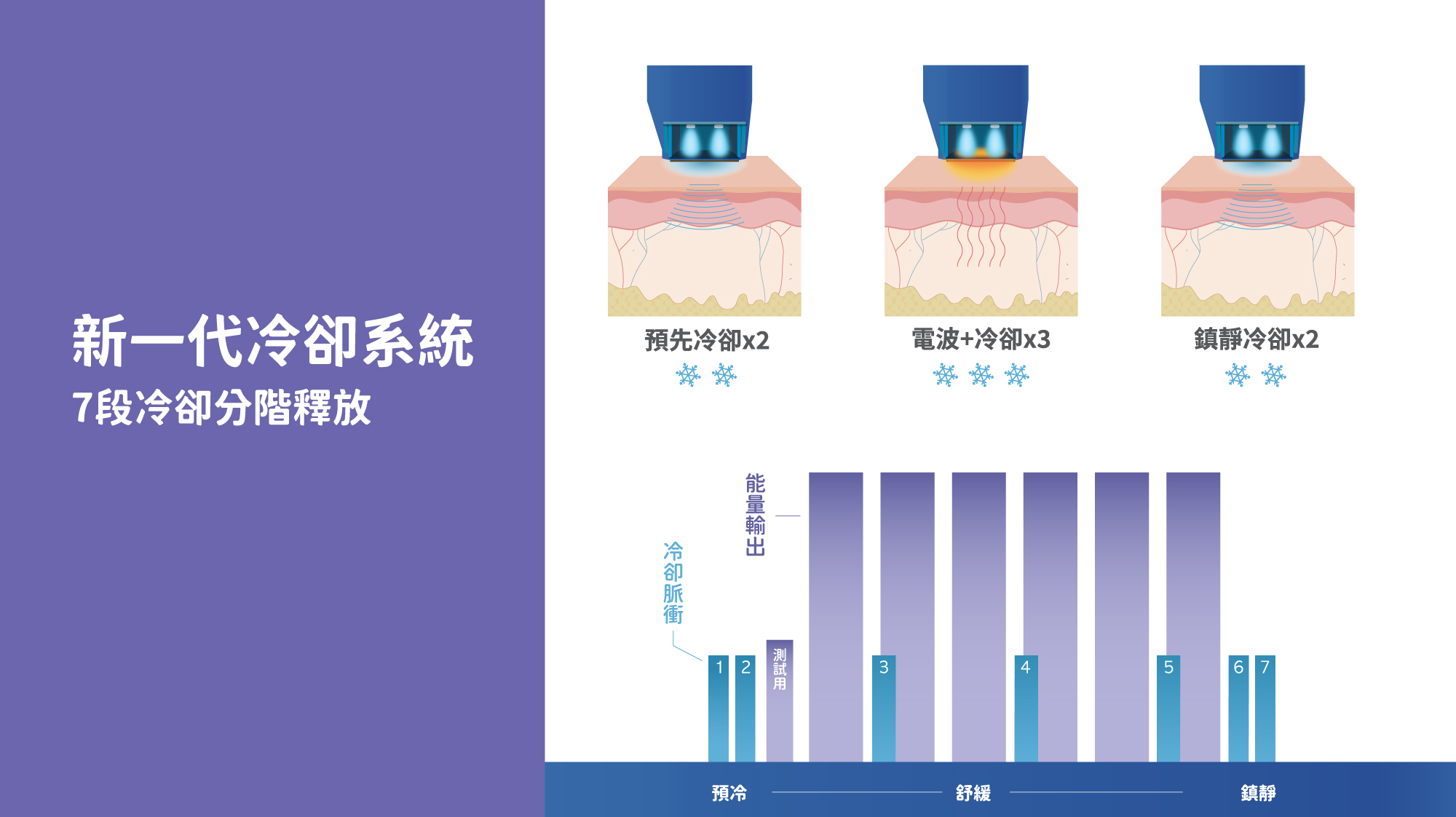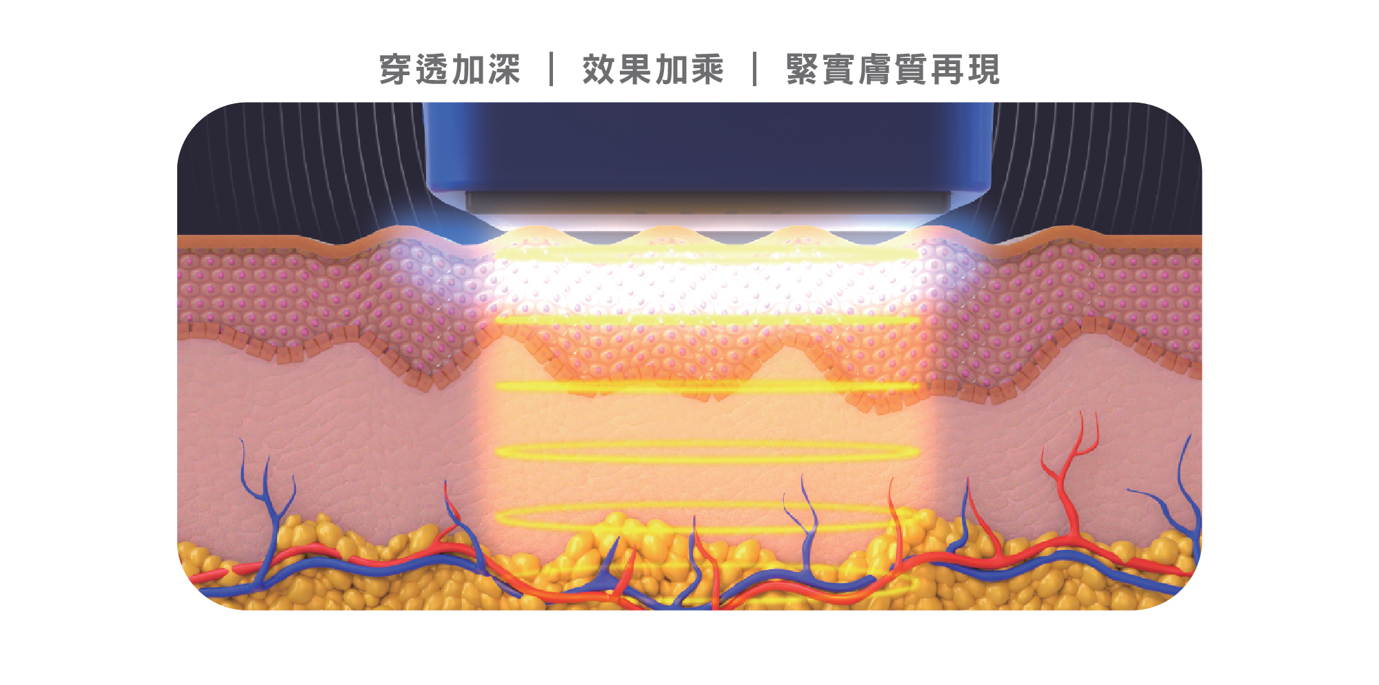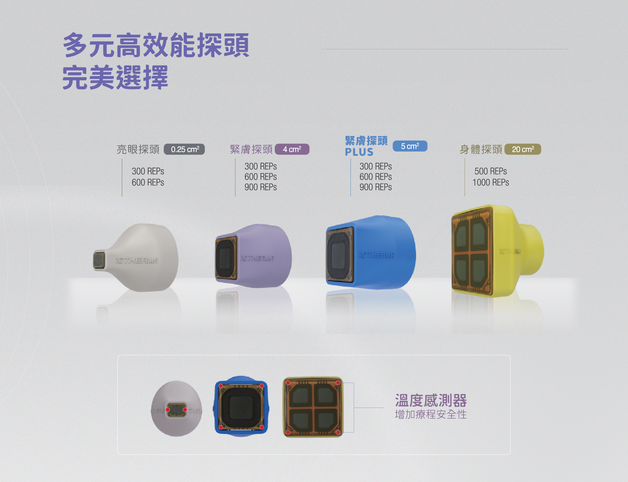 獨特的臉部緊實5cm²探頭,不僅提升每發有效治療面積,同時也增加了能量累積,每個角落都不遺漏。配合不同的位置,可搭配身體探頭、眼周探頭,以及兩種不同尺寸的臉部探頭。