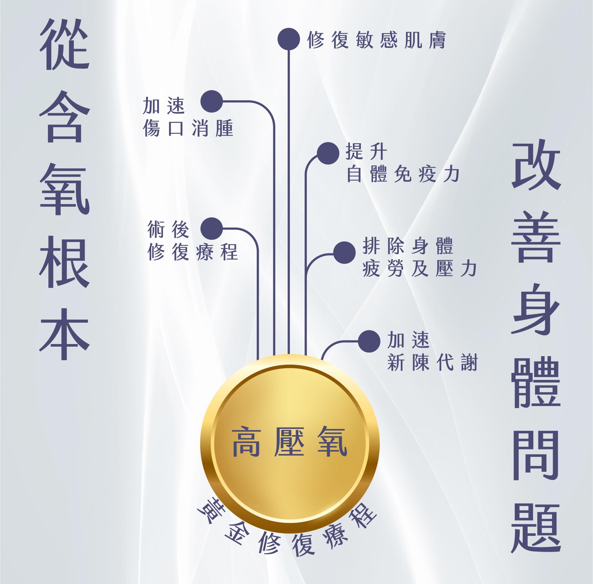 安全合法的院所使用台灣衛生署核可的高壓氧醫療儀器。高壓氧治療讓使用者進入一個完全密閉的壓力艙,進入艙內壓力將逐漸提升至1.4以上的大氣壓力,讓使用者吸入更高濃度的氧氣,一般情況下氧氣在體內的運送大多由血紅素運送,而身處高壓氧時氧氣將溶氧到血漿中,這些富含氧氣的血漿能夠更進一步的擴散到身體其他組織,使身體細胞得到更多能量,達到修復受損組織的效果。