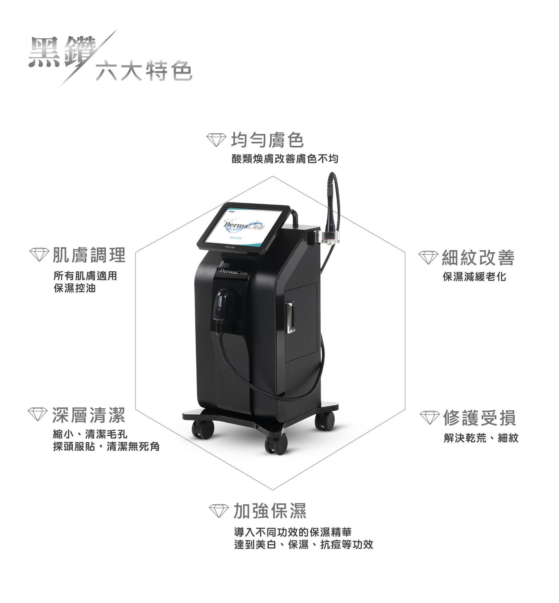 臉部清潔後利用360度旋轉探頭產生真空水渦旋,溫和無痛的深入毛孔沖刷掉老廢角質,並利用真空渦漩吸引抽走黑頭粉刺、多餘皮脂及髒汙。