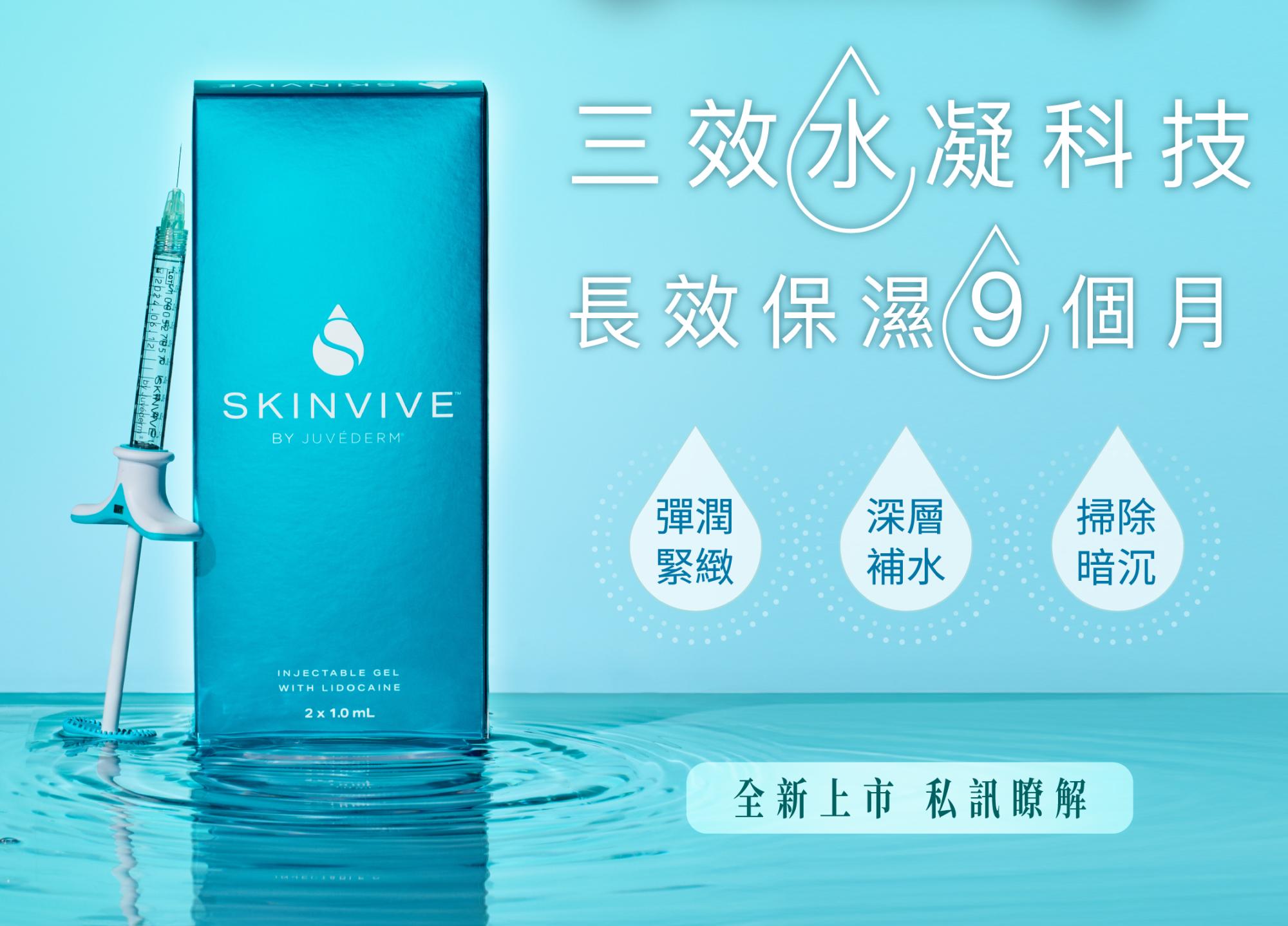 作為市場上持效最久的玻尿酸注射產品,SKINVIVE®僅需一次療程即可為肌膚深層補水,不僅能由內而外保濕肌膚,還能提升肌膚的光澤、改善毛孔細紋、提升平滑感以及均勻膚色。可依愛美者的需求客製化醫療療程。