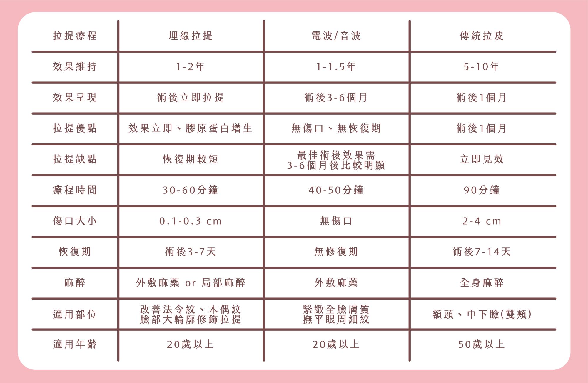 適用於 30-40歲左右的熟女,因此時肌膚剛進入初老階段,提拉V臉、刺激肌膚增生膠原蛋白的效果較佳。至於超過40歲的患者,由於皮膚較為鬆垮,拉提效果往往不如預期,建議改採音波或電波拉皮,成效會比較符合預期。