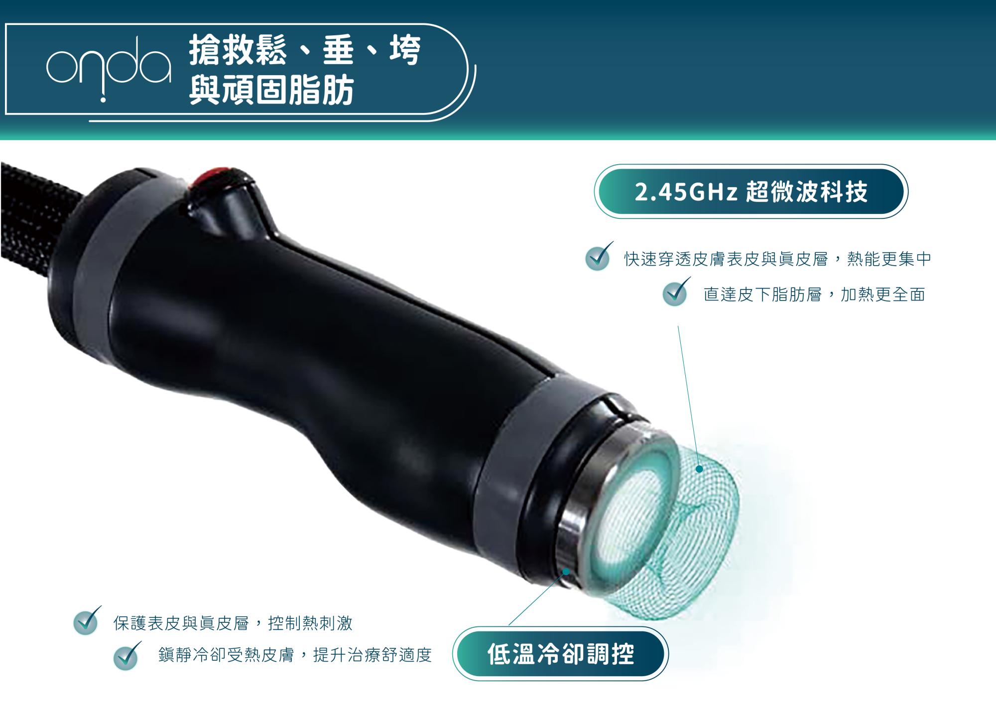 2.45GHz超高頻率的微波技術可以深入到皮下0.7-1.2cm,快速加熱深層脂肪細胞,使脂肪周圍升溫去破壞脂肪細胞膜造成受損,受損的脂肪細胞因裂解作用,進而激發吞噬細胞啟動,將壞死細胞代謝並經由人體正常排出,使脂肪細胞數量減少,改善局部頑固脂肪型鬆垂的外觀。