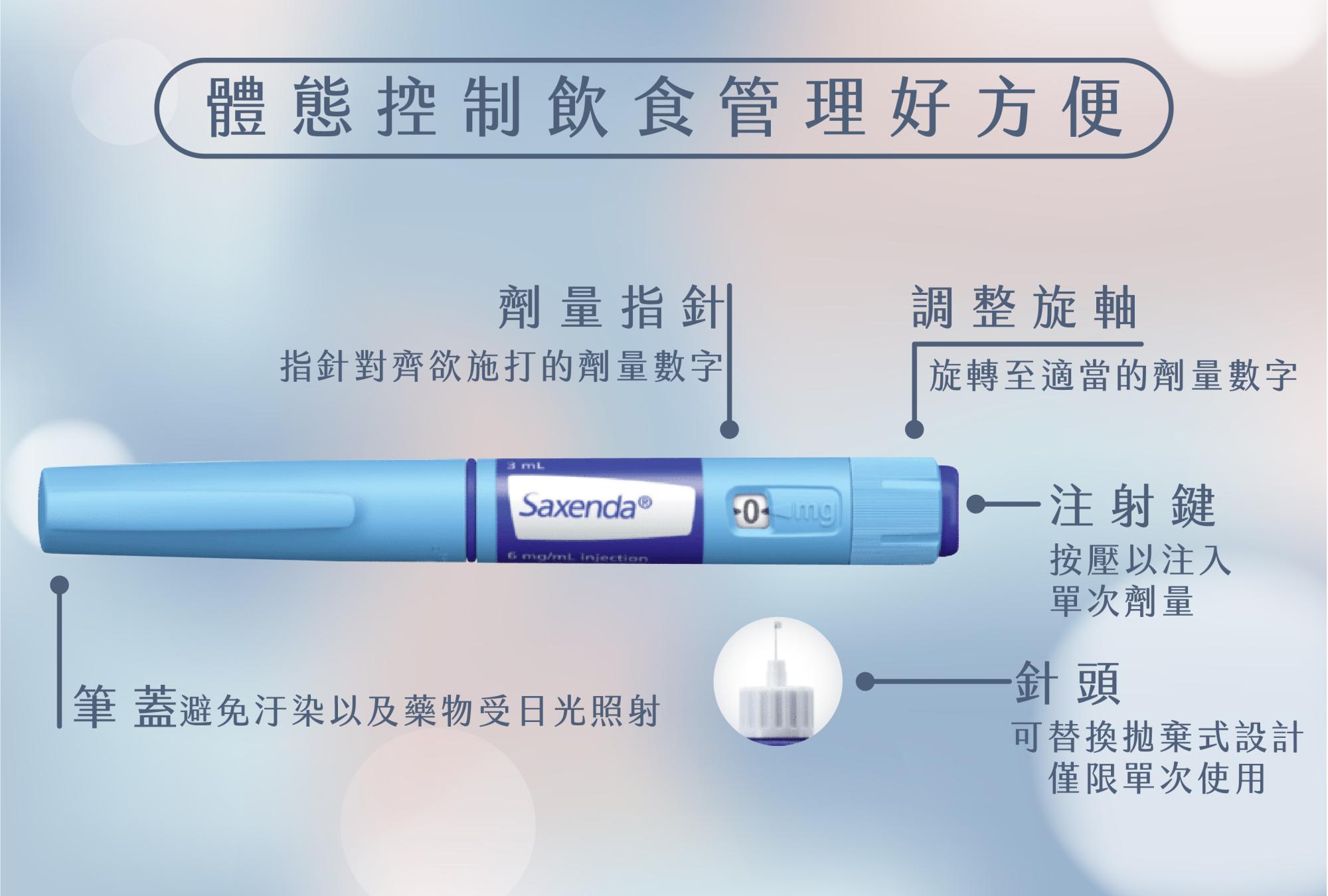 完整的Saxenda®善纖達產品為一盒3入,每支筆的容量為3ml(毫升),並含有18mg(毫克)的藥劑成分。