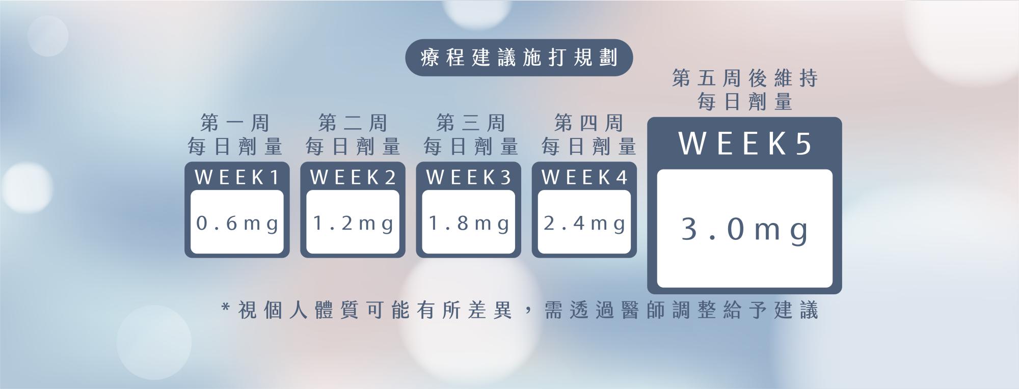 建議起始劑量為每日一次 0.6 mg,施打至少第一週後,可逐漸以每周為單位、每次再增加 0.6 mg,直至第五周起維持每日一次 3.0 mg的施打劑量: