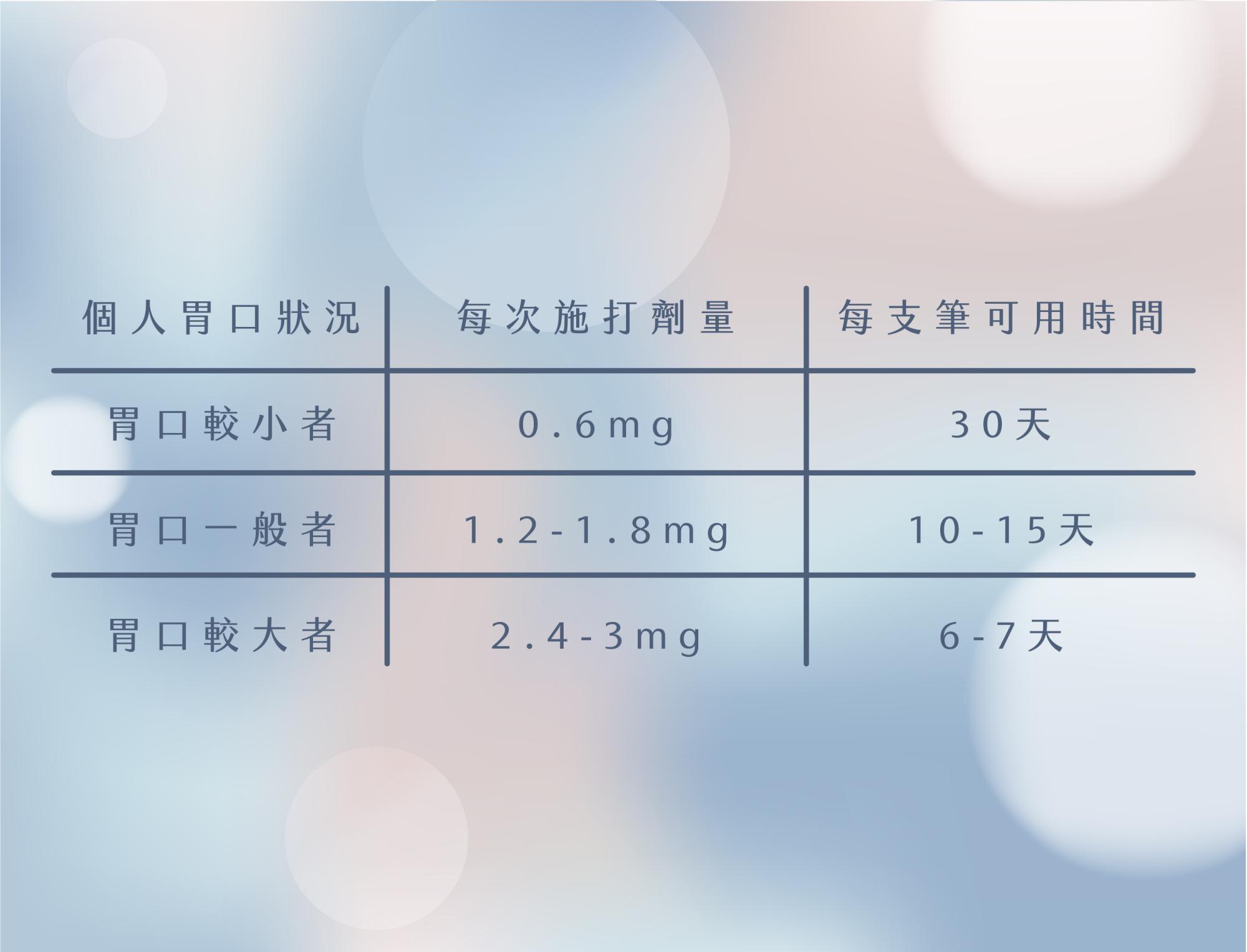 -胃口一般者:每次施打1.2~1.8mg/每支筆可打10~15天